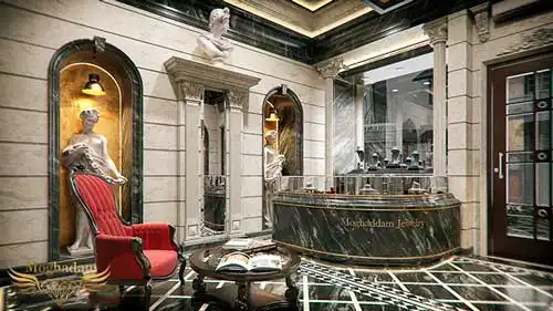 الديكور بالكامل لمتجر المجوهرات يجمع بين الوقار التقليدي والأجواء الحديثة العصرية. يجذب ديكور متجر المجوهرات العملاء المسنين ويحتفظ بهم، بينما يجذب الشباب الذين يتابعون الموضة.